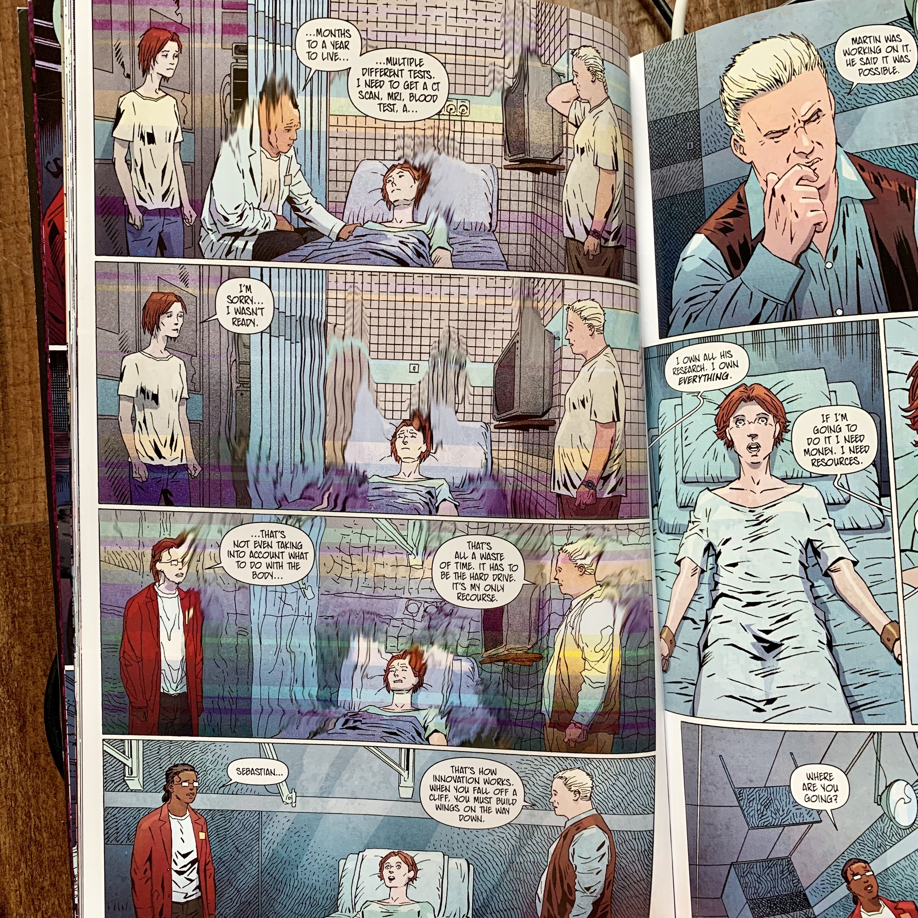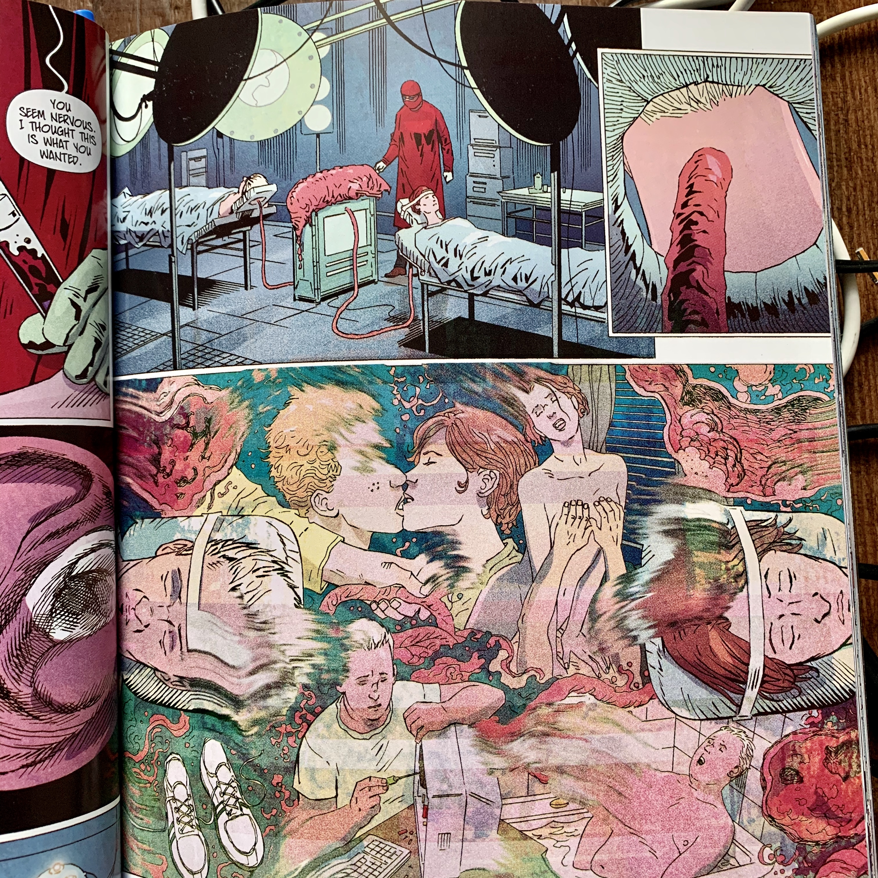 To say much more would be to spoil all the wild turns this story takes. And let’s be clear, the turns are indeed wild. But they’re also inventive, imaginative, and intriguing. Lots of concepts are being thrown together, and thankfully most of them stick. The story manages to touch on ideas of escapism, scientific enlightenment, medicine in the public vs private sphere, loneliness, death, memory, Locke’s theory of tabula rasa, and our base need for connection – all with a good dose of Cronenberg-esque body horror. In fact, like many of Cronenberg’s films the story could easily fall to camp, but instead the writers bolster it with real emotion and serious thematic implications. That’s right, it’s body horror with brains!