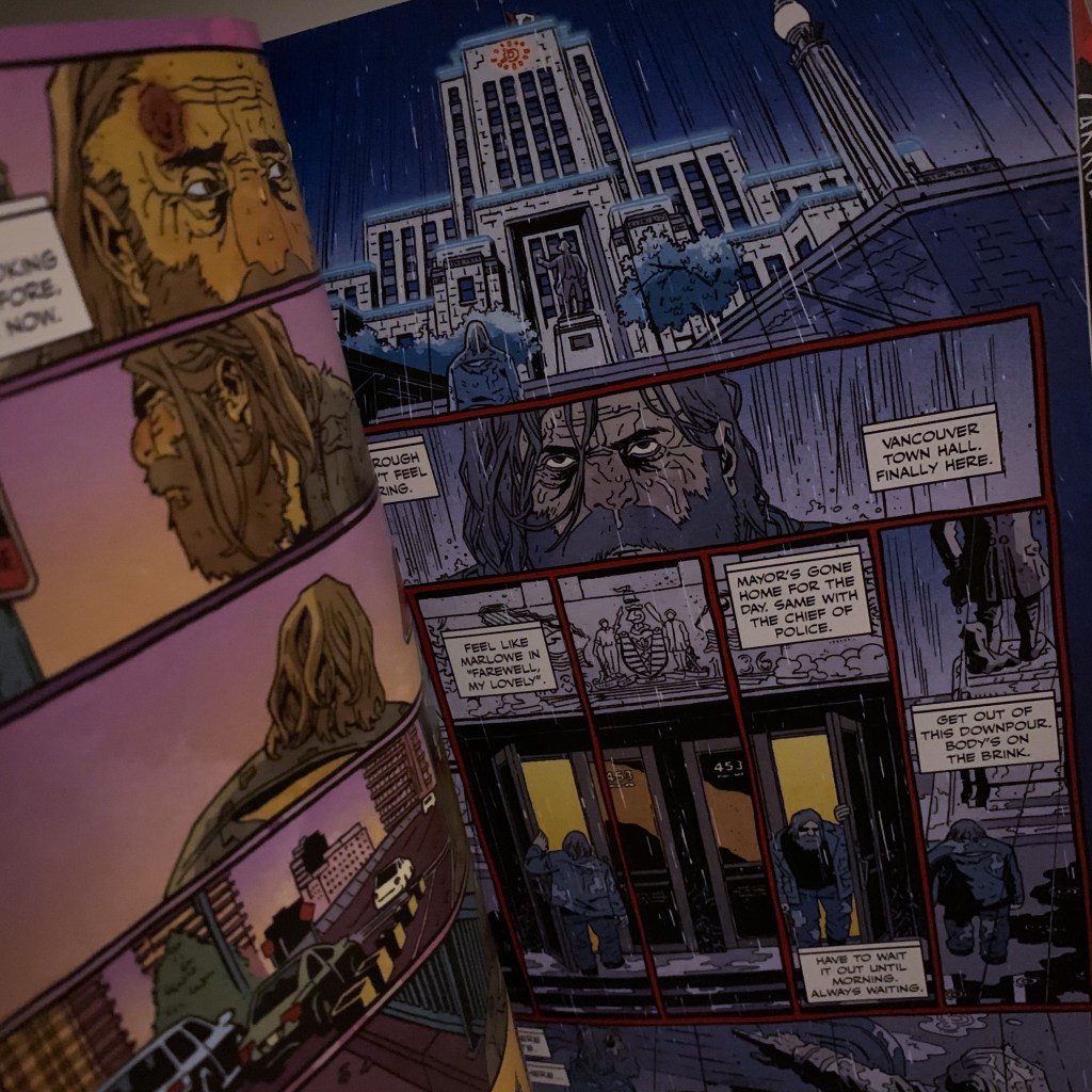 The writing is smart, nuanced, and loaded with subtext. With a provocative concept and a sprawling storyline, the comic is based in real world issues but painted over with a darkly satirical brush. Coined as “the first homeless meta noir,” it’s a literary blend of Jonathan Swift, Raymond Chandler, and Warren Ellis (oh, and a dash of Bazterrica’s Tender is the Flesh 😳).